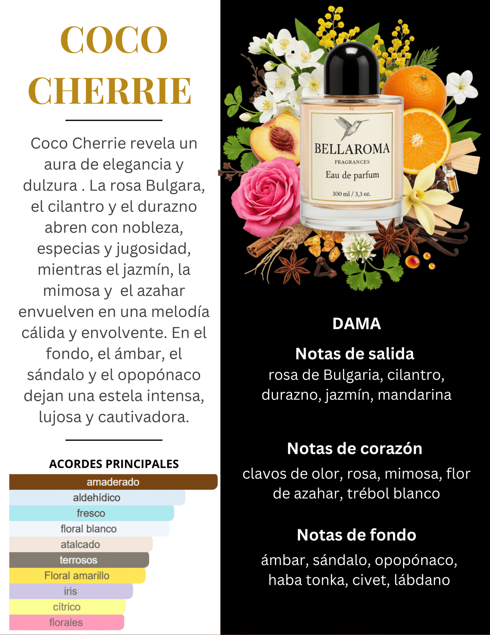Coco Cherrie es una fragancia que fusiona la elegancia clásica con una dulzura moderna y seductora, creada para la mujer que irradia poder, confianza y encanto natural.