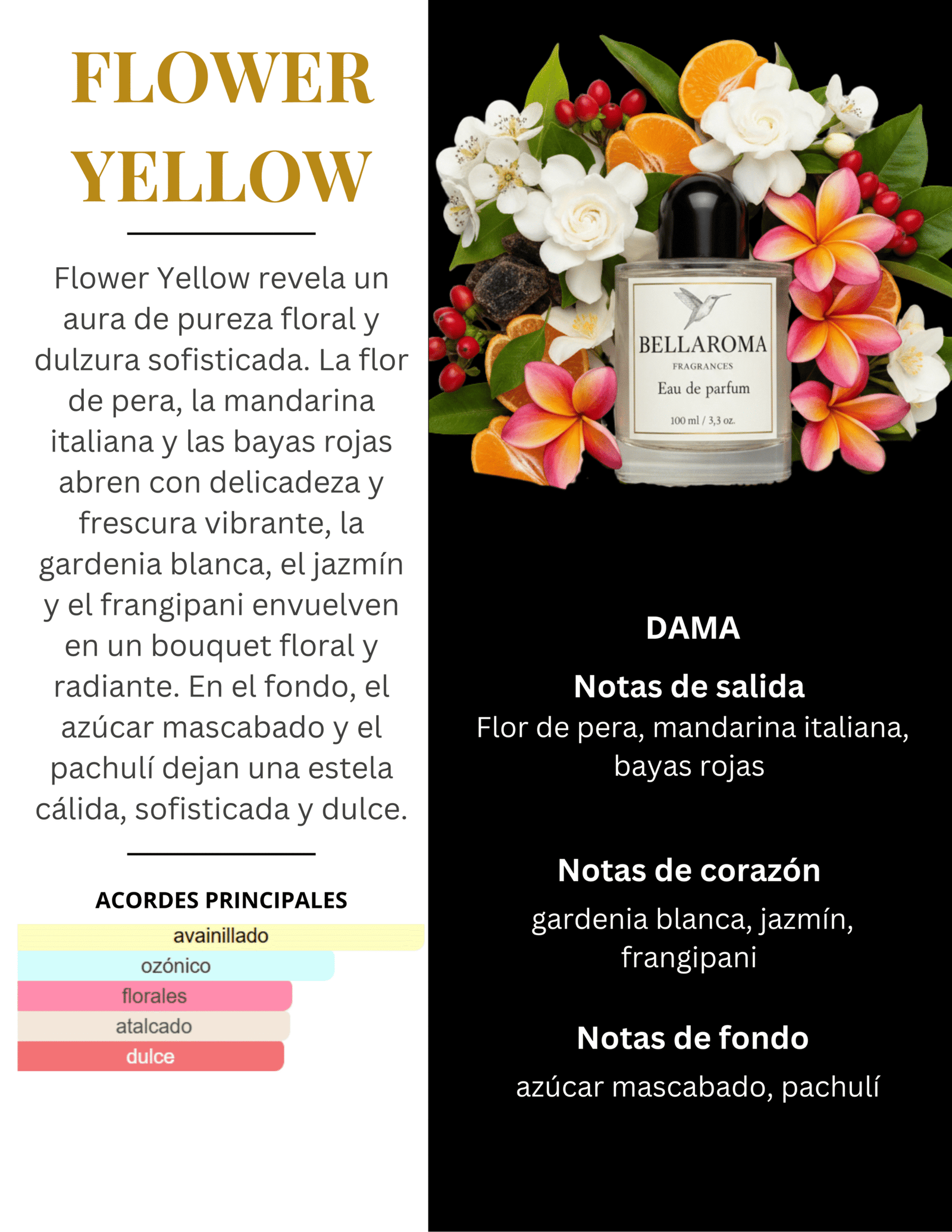 Flower Yellow es una fragancia que celebra la pureza floral y la dulzura sofisticada, envolviendo los sentidos en un aura luminosa y encantadora.