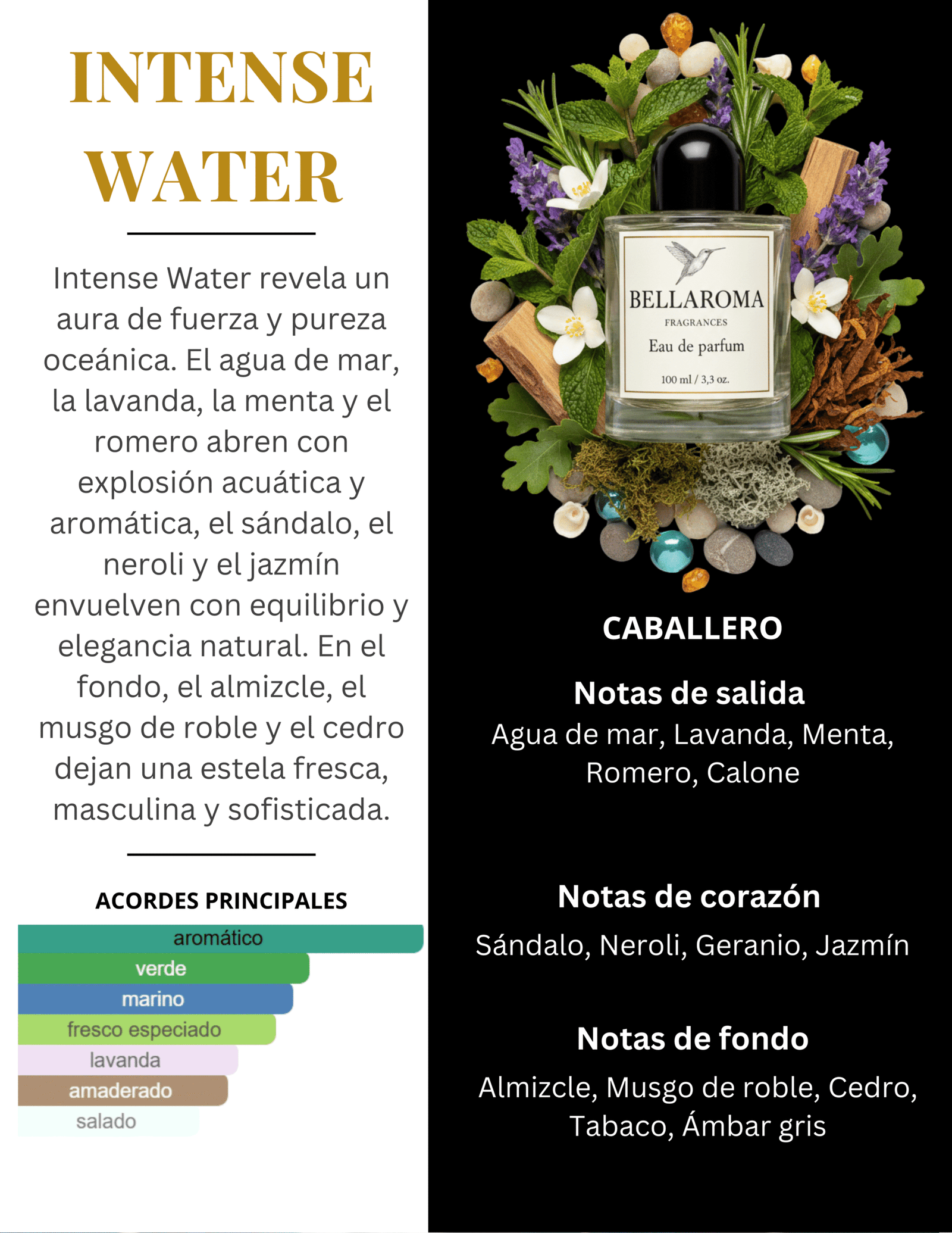 Intense Water es una fragancia vibrante y revitalizante que captura la energía del mar y la elegancia del hombre contemporáneo.