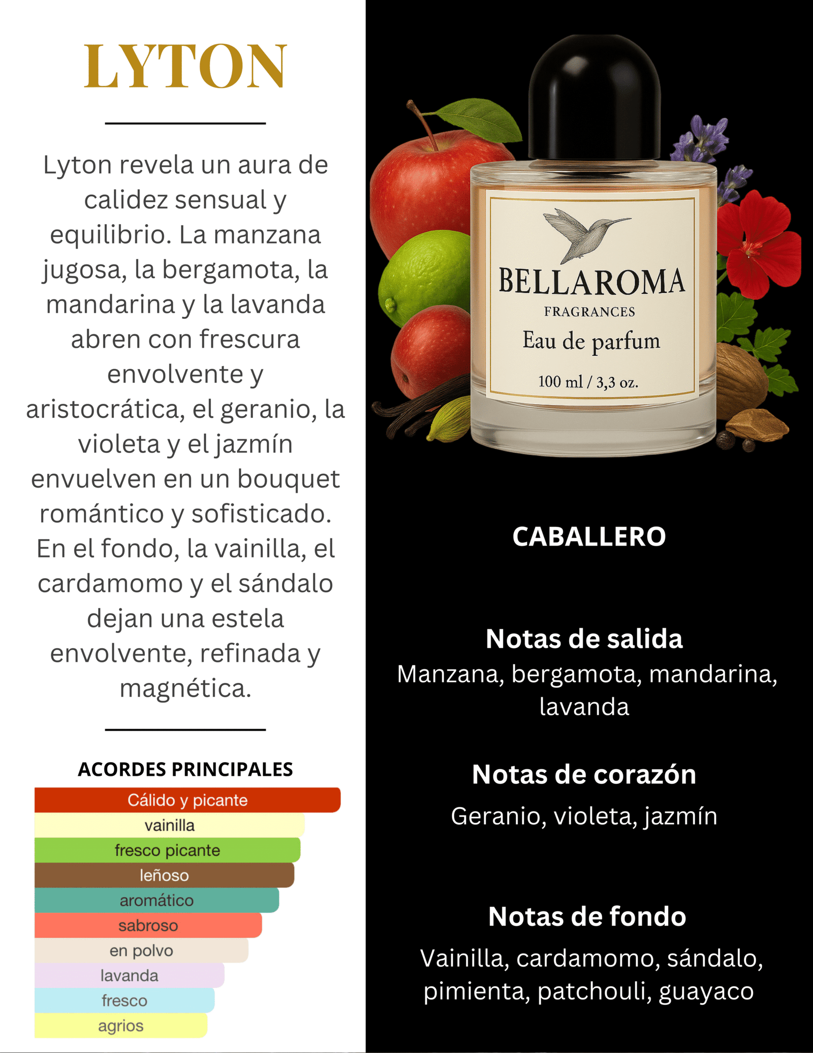 Finalmente, la base revela una sinfonía cálida de vainilla cremosa, cardamomo especiado, sándalo aterciopelado, pimienta sutil, patchouli terroso y madera de guayaco, dejando una estela magnética, refinada y duradera.