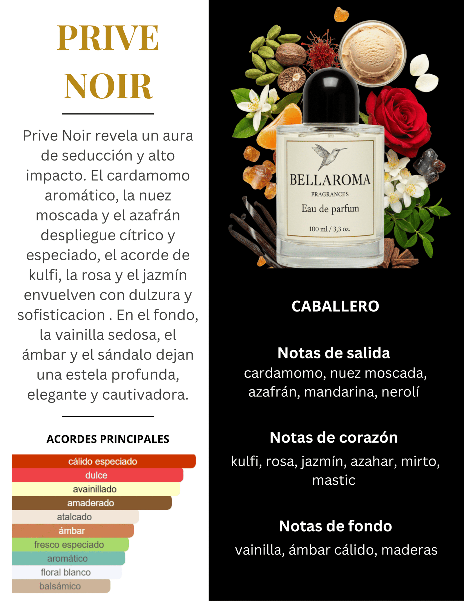 Prive Noir es una fragancia gourmand, especiada y maderosa que encarna la seducción refinada y el poder de la noche.