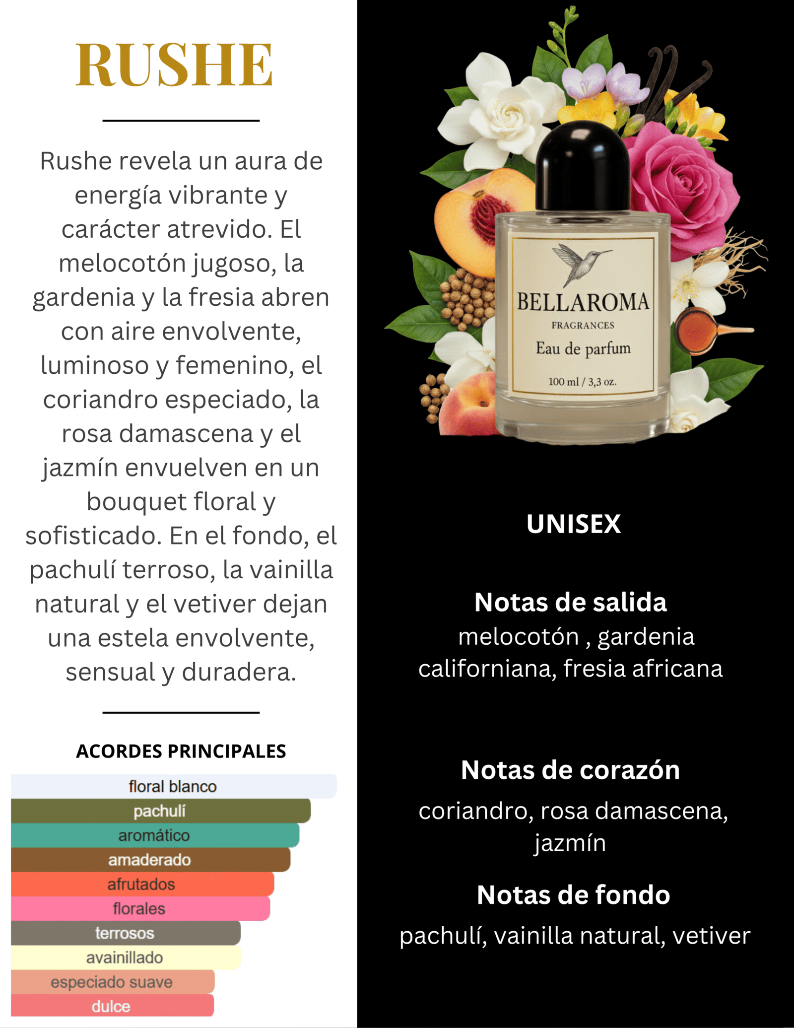 Rushe es una fragancia que celebra la energía vibrante, la feminidad libre y el encanto que desafía lo convencional.