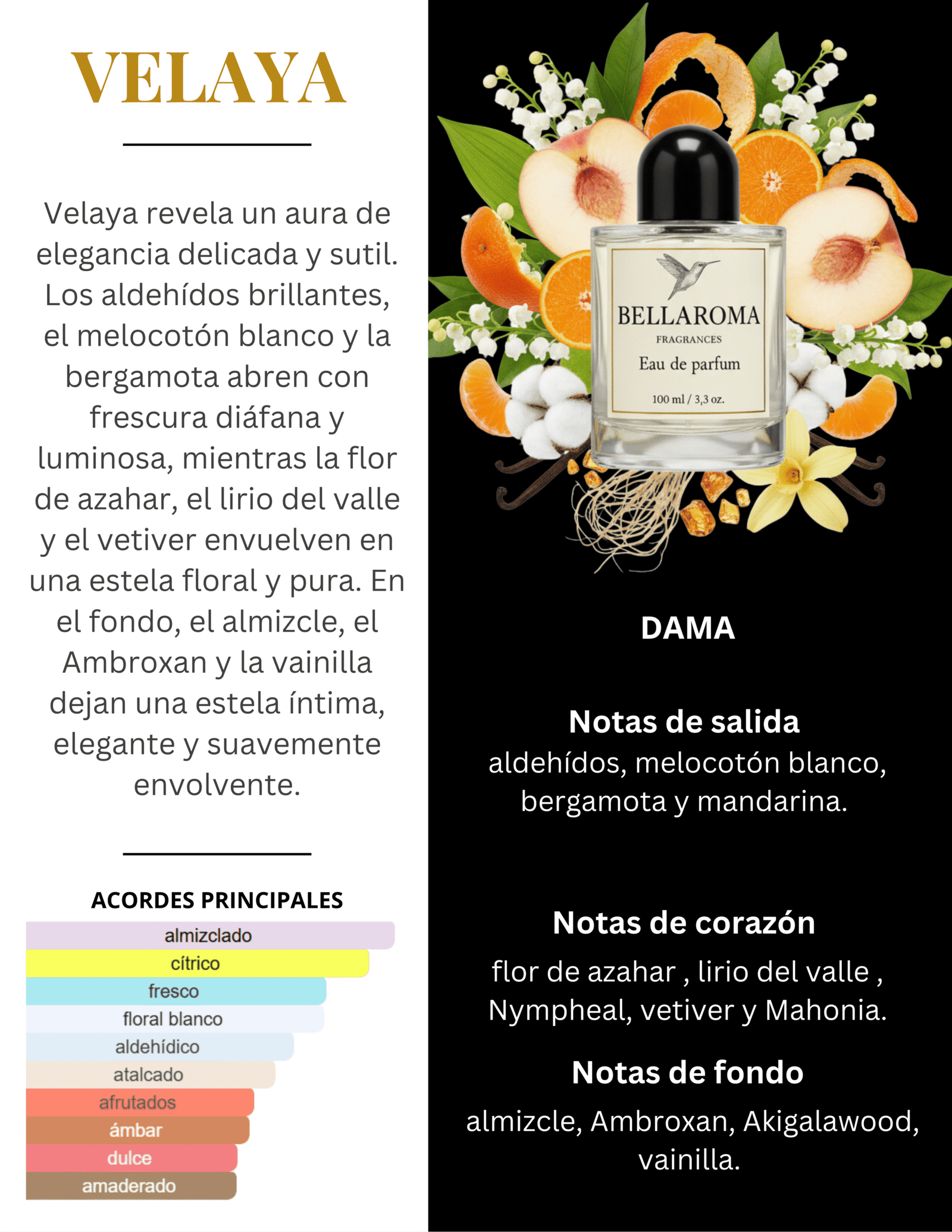 Velaya es una fragancia que envuelve la piel como una caricia de algodón, evocando una elegancia etérea y serena.